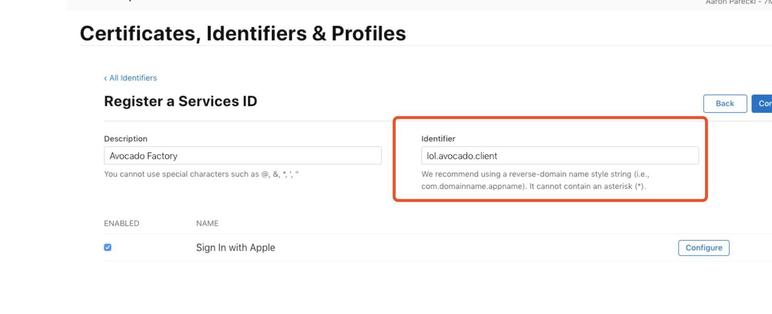 为了在谷歌包中实现苹果登录,需要在苹果Developer后台创建一个参数,配置2个地址。